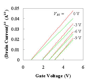 The variation of the threshold voltage with the applied bulk-to-source voltage can be observed by plotting the transfer curve for different bulk-to-source voltages. The expected characteristics, as calculated using the quadratic model and the variable depletion layer model, are shown in Figure 7.4.2. |
