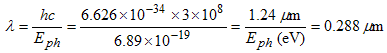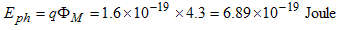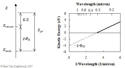 Albert Einstein explained this experiment by postulating that the energy of light is quantized. He assumed that light consists of individual particles called photons, so that the kinetic energy of the electrons, K.E= p2/2m equals the energy of the photons, Eph, minus the energy, qΦM, required to extract the electrons from the metal. The workfunction, ΦM,therefore quantifies the potential, which the electrons have to overcome to leave the metal. The slope of the curve was measured to be 1.24 eVμm, which yielded the following relation for the photon energy, Eph: |