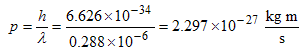 where λ is the wavelength, h is Planck's constant and p is the particle momentum. This expression enables a correct calculation of the ground energy of an electron in a hydrogen atom using the Bohr model described in Section 1.2.4. One can also show that equation (1.2.2) can be obtained by combining equation (1.2.1) with Eph = p c, which means that one combines the result from the photo-electric effect with the classical equation for particles describing the kinetic energy by the product of its momentum and velocity. |