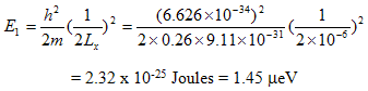 Example 1.3 ![]() | An electron is confined to a 1 micron thin layer of silicon. Assuming that the semiconductor can be adequately described by a one-dimensional quantum well with infinite walls, calculate the lowest possible energy within the material in units of electron volt. If the energy is interpreted as the kinetic energy of the electron, what is the corresponding electron velocity? (The effective mass of electrons in silicon is 0.26 m0, where m0 = 9.11 x 10-31 kg is the free electron rest mass as listed in Appendix 2). |