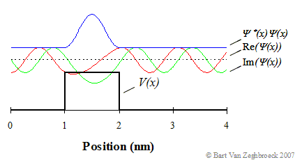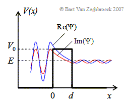 | Figure 1.2.9: | Tunneling through a thin barrier. Shown are the potential energy of the barrier, V(x), as well as the real and imaginary part of the wavefunction of a particle with energy, E, penetrating the barrier. |