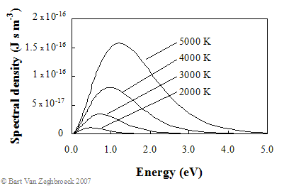 | Figure 1.2.3: | Spectral density of a blackbody at 2000, 3000, 4000 and 5000 K versus energy. ![]() |