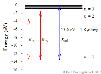 The maximum photon energy emitted from a hydrogen atom equals 13.6 eV. This energy is also called one Rydberg or one atomic unit. The electron transitions and the resulting photon energies are further illustrated by Figure 1.2.4. |