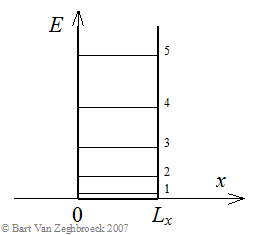 | Figure 1.2.6 : | Potential energy of an infinite well, with width Lx. Also indicated are the lowest five energy levels in the well. |