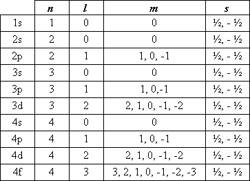 Since the hydrogen atom is a three-dimensional problem, three quantum numbers, labeled n, l, and m, are needed to describe all possible solutions to Schrödinger's equation and are obtained as the eigenvalues when solving equations (1.2.31) through (1.2.33). The spin of the electron is described by the quantum number s. The energy levels only depend on n, the principal quantum number and are given by equation (1.2.10). The electron wavefunctions however are different for every different set of quantum numbers. While a derivation of the actual wavefunctions is beyond the scope of this text, a list of the possible quantum numbers is needed for further discussion and is therefore provided in Table 1.2.2. For each principal quantum number n, all smaller positive integers are possible values for the quantum numberl. The quantum number m can take on all integer values between l and -l, while s can be ½ or -½. This leads to a maximum of 2 unique sets of quantum numbers for all s orbitals (l = 0), 6 for all p orbitals (l = 1), 10 for all d orbitals (l = 2) and 14 for all f orbitals (l = 3). |