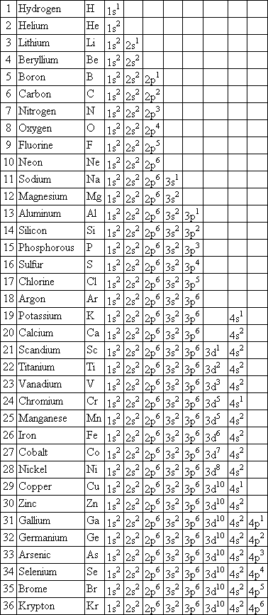 | Table 1.2.3: | Electronic configuration of the first thirty-six elements of the periodic table. |