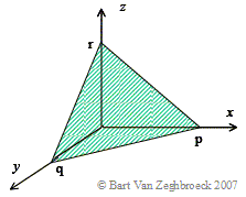 Crystal planes of a crystal are characterized by their Miller indices. The Miller indices are defined as the smallest possible integers, which have the same ratios as the inverse of the intersections of a given plane with a set of axis defined by the unit vectors of that crystal. This definition is further illustrated with Figure 2.2.4.The intersections between the plane and the axis occur at p, q, and r. The corresponding Miller indices are therefore |