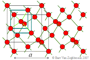 The most common crystal structure among frequently used semiconductors is the diamond lattice, shown in Figure 2.2.5. Each atom in the diamond lattice has a covalent bond with four adjacent atoms, which together form a tetrahedron. This lattice can also be formed from two face-centered-cubic lattices, which are displaced along the body diagonal of the larger cube in Figure 2.2.5 by one quarter of that body diagonal. The diamond lattice therefore is a face-centered-cubic lattice with a basis containing two identical atoms. |