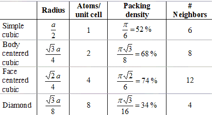 Close packing of atoms results in a lower energy and therefore a preferred arrangement. Based on the table above, one finds that the FCC structure is preferred since the largest number of close neighbors results in the lowest energy of particles. However, the required number of chemical bonds must be satisfied at the same time. FCC crystals therefore typically occur when the strength of the chemical bonds is relatively weak such as for monovalent metals including copper, gold, and silver. Another example is opal, a gemstone, which consists of submicron silica spheres. Van der Waals forces dominate in this structure, while there is no further selection, as there are no chemical bonds. Opal is therefore a closed packed FCC structure. Group IV covalent semiconductors including silicon and germanium need to have four neighbors to obtain a fully filled outer shell by sharing their electrons in the outer shell with neighboring atoms. The diamond structure satisfies this requirement and is indeed the corresponding crystal structure. |