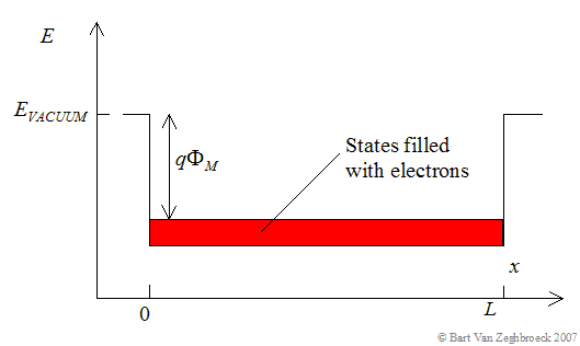 The free electron model of metals has been used to explain the photo-electric effect (see section 1.2.2). This model assumes that electrons are free to move within the metal but are confined to the metal by potential barriers as illustrated by Figure 2.3.1. The minimum energy needed to extract an electron from the metal equals qΦM, where ΦM is the workfunction. This model is frequently used when analyzing metals. However, this model does not work well for semiconductors since the effect of the periodic potential due to the atoms in the crystal has been ignored. |