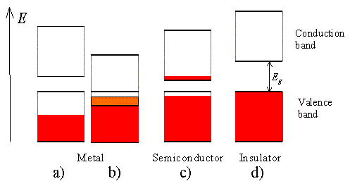 A half-filled band is shown in Figure 2.3.10 a). This situation occurs in materials consisting of atoms, which contain only one valence electron per atom. Most highly conducting metals including copper, gold and silver satisfy this condition. Materials consisting of atoms that contain two valence electrons can still be highly conducting if the resulting filled band overlaps with an empty band. This scenario is shown in b). No conduction is expected for scenario d) where a completely filled band is separated from the next higher empty band by a larger energy gap. Such materials behave as insulators. Finally, scenario c) depicts the situation in a semiconductor. The completely filled band is now close enough to the next higher empty band that electrons can make it into the next higher band. This yields an almost full band below an almost empty band. We will call the almost full band the valence band since it is occupied by valence electrons. The almost empty band will be called the conduction band, as electrons are free to move in this band and contribute to the conduction of the material. |