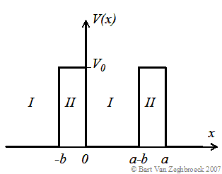 The Kronig-Penney consists of an infinite series of rectangular barriers with potential height, V0, and width, b, separated by a distance, a-b, resulting in a periodic potential with period, a. The analysis requires the use of Bloch functions, traveling wave solutions multiplied with a periodic function, which has the same periodicity as the potential. The actual derivation can be found in section 2.3.8. |