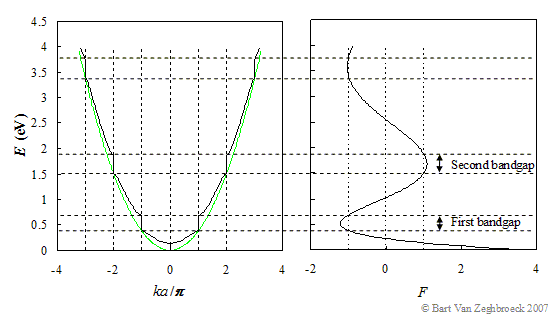 This equation can only be solved numerically. Solutions are only obtained if the function, F, is between -1 and 1 since it has to equal cos(ka). The energy, E, is plotted as function of ka/π and the function F in Figure 2.3.4. |