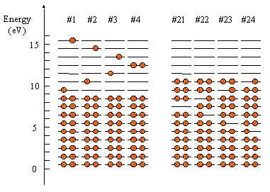 | Figure 2.5.2 : | Eight of the 24 possible configurations in which 20 electrons can be placed having a total energy of 106 eV. |