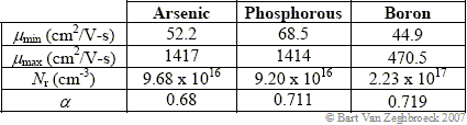 where μmin, μmax, α and Nr are fit parameters. These parameters for arsenic, phosphorous and boron doped silicon are provided in Table 2.7.2. |