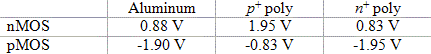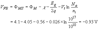 | Example 6.1 | Calculate the flatband voltage of a silicon nMOS capacitor with a substrate doping Na = 1017 cm-3 and an aluminum gate (FM = 4.1 V). Assume there is no fixed charge in the oxide or at the oxide-silicon interface. |