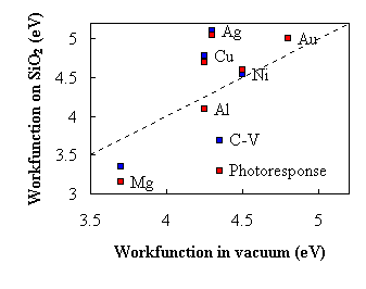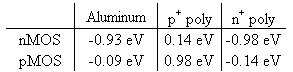 The workfunction is the voltage required to extract an electron from the Fermi energy to the vacuum level. This voltage is between three and five Volt for most metals. The actual value of the workfunction of a metal deposited onto silicon dioxide is not exactly the same as that of the metal in vacuum. Figure 6.3.1 provides experimental values for the workfunction of different metals, as obtained from a measurement on a MOS capacitor, as a function of the measured workfunction in vacuum. The same data is also listed in Table 6.3.1. |