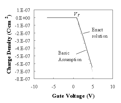 The linear proportionality can be explained by the fact that a gate voltage variation causes a charge variation in the inversion layer. The proportionality constant between the charge and the applied voltage is therefore expected to be the gate oxide capacitance. This assumption also implies that the inversion layer charge is located exactly at the oxide-semiconductor interface. |