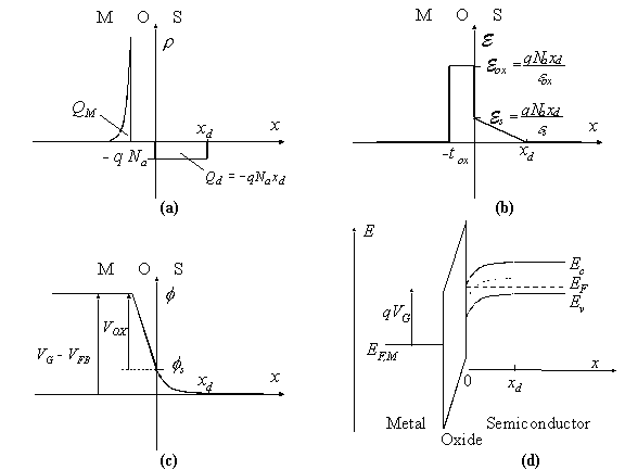 | Figure 6.3.3: | Electrostatic analysis of an MOS structure. Shown are (a) the charge density, (b) the electric field, (c) the potential and (d) the energy band diagram for an nMOS structure biased in depletion. |