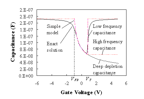 In order to find the capacitance corresponding to a specific value of the gate voltage, we also need to use the relation between the potential across the depletion region and the gate voltage, given by: |