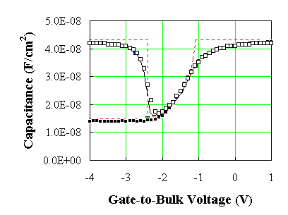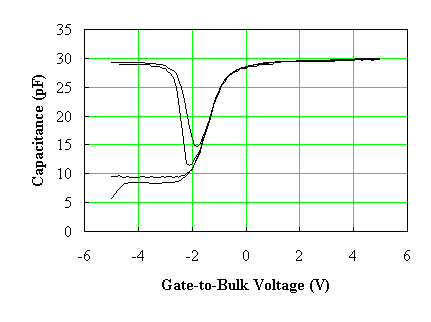 The high frequency capacitance is obtained from a small-signal capacitance measurement at high frequency. The bias voltage on the gate is varied slowly to obtain the capacitance versus voltage. Under such conditions, one finds that the charge in the inversion layer does not change from the equilibrium value at the applied dc voltage. The high frequency capacitance therefore reflects only the charge variation in the depletion layer and the (rather small) movement of the inversion layer charge. |