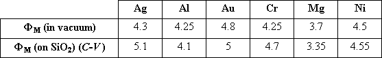 | Table 6.3.1: | Workfunction of selected metals as measured in vacuum and as obtained from a C-V measurement on an MOS structure. |