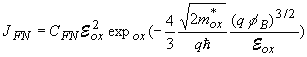 Fowler-Nordheim tunneling has been studied extensively in Metal-Oxide-Semiconductor structures where it has been shown to be the dominant current mechanism, especially for thick oxides. The basic idea is that quantum mechanical tunneling from the adjacent conductor into the insulator limits the current through the structure. Once the carriers have tunneled into the insulator they are free to move within the valence or conduction band of the insulator. The calculation of the current is based on the WKB approximation (as derived section 3.3.4) yielding the following relation between the current density, JFN, and the electric field in the oxide, |