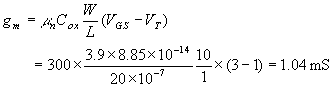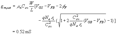 The transconductance can again be calculated using (7.3.12). This equation combined with the saturation voltage (equation (7.3.25)) yields the following transconductance in saturation: |