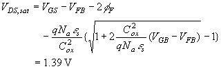 The current-voltage characteristics as obtained with the above equation are shown in Figure 7.3.3, together with those obtained with the quadratic model. Again, it was assumed that the drain current saturates at its maximum value, since a positive inversion layer charge cannot exist in an n-type MOSFET. The drain voltage at which saturation occurs is given by: |